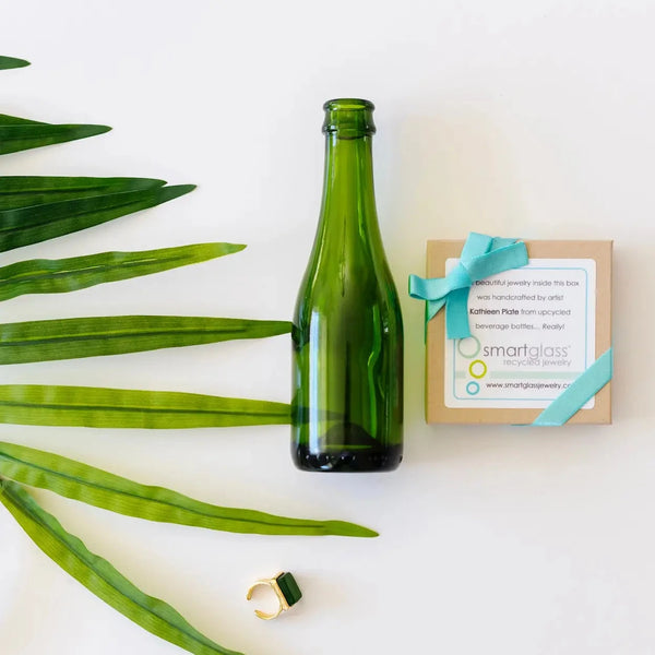 The Smartglass Cube Adjustable Gold Ring - Antique Clear is the epitome of elegance and sophistication. Recycled glass bottles are collected from bars, restaurants, friends, and dumpsters and transformed into the ultimate "cocktail" ring. 22K gold plated pewter. Glass approximately .75 inch x .75 inch square.