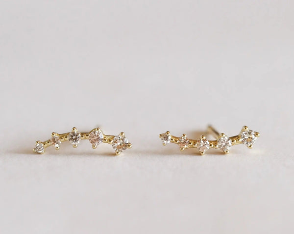 These five-stone cascading crawlers feature champagne cubic zirconia set in 18k gold-plated sterling silver. Measures length is approximately 1/2" across. Carded on crisp white paper squares with gold-foiled accents. Handmade in USA.