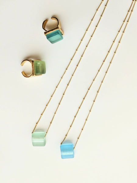 The Smartglass Cube Gold Necklace - Aqua is beautiful, simple, and intriguing. Made from recycled glass bottles are transformed into seaglass style beads. Beads are roughly 1 inch by 1 inch or smaller (they will vary in size and shape), finished with an 18 inch gold fill chain.